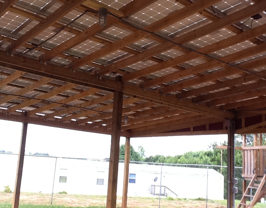 Our newest project we finished is at Meadow Brook Community Laundry & Community Center. We installed a Solar PV system at this location that powers the laundry and the community center. With this project, we made some improvements to the design of our project. This time, we located the solar panels on top of a shade canopy behind the building on the playground that will serve as a picnic area, and we located the inverters for the system right inside of the laundry center. The solar panels on top of the building actually serve as the roof and the ceiling of the canopy. Standing under the canopy, you can look up and actually see the solar panels at work. While waiting on your clothes to wash, you can watch the inverters to see how much power the sun is generating. We made these changes to our second project, because we wanted people in the community to be able to enjoy and learn about the green energy technology available. We believe it is important to take advantage of the green energy technology that is available, and it is vital to teach our future generations about ways we can take care of our Earth.